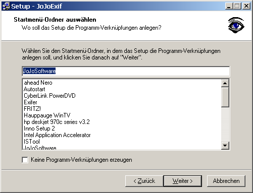 Anschließend wird als Eintrag im Startmenü JoJoExif in der Programmgruppe JoJoSoftware vorgeschlagen.
